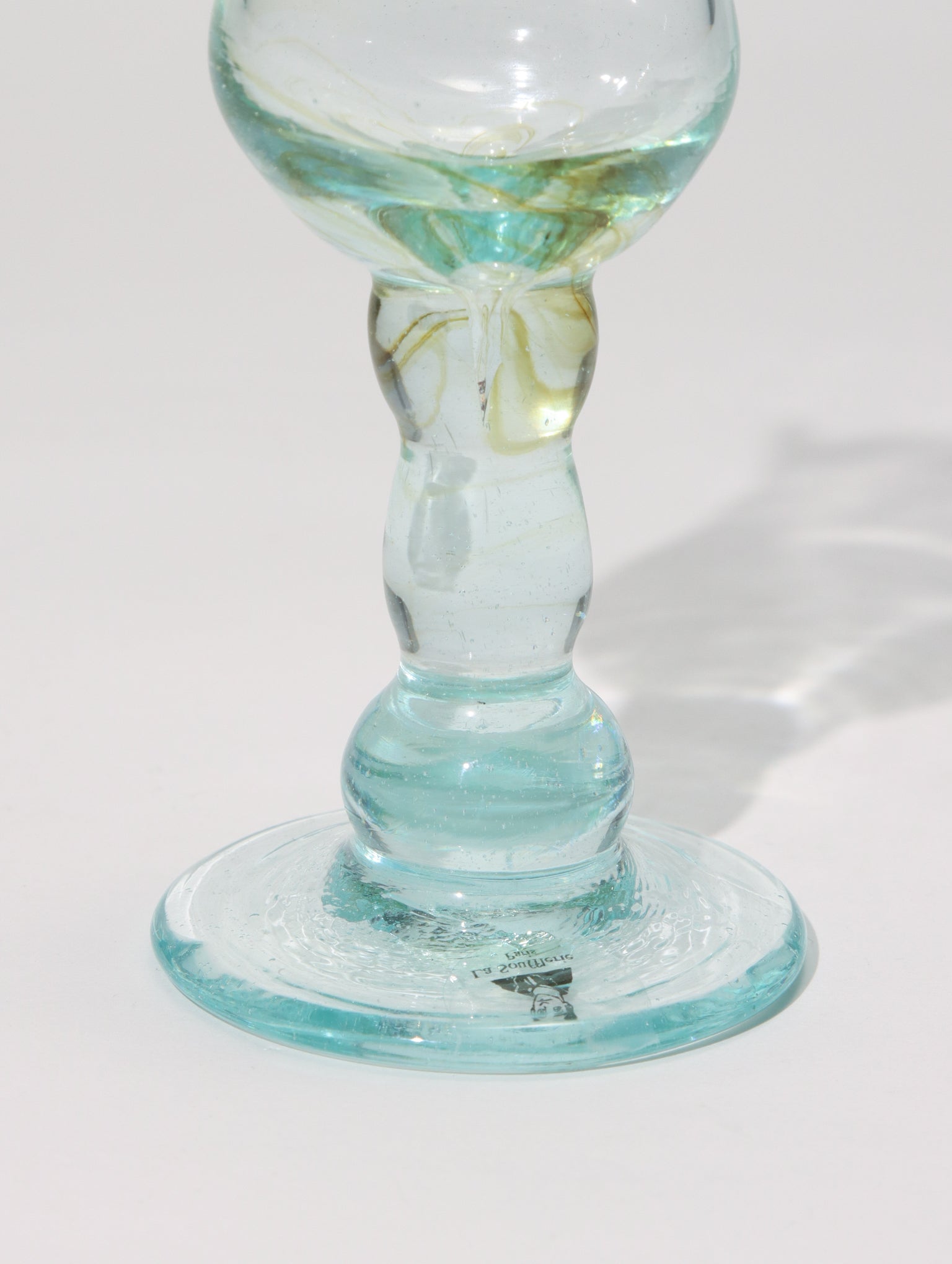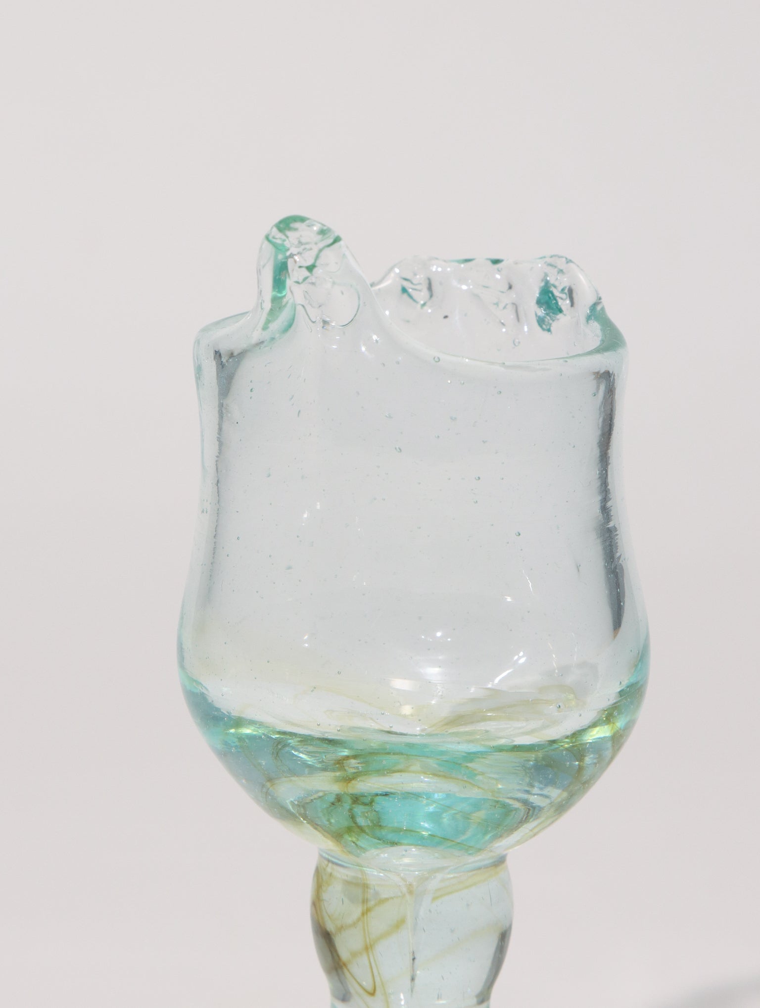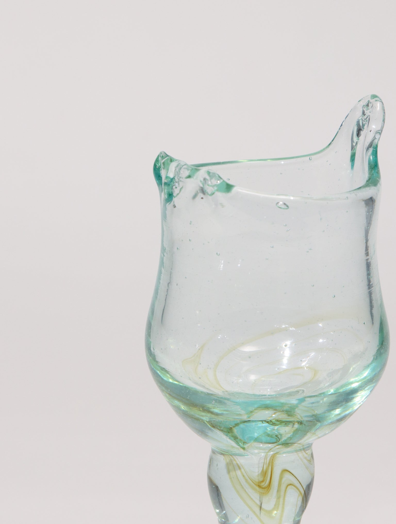 ガラス製のエッグスタンドです。海外の朝食のような優雅な食卓を演出してくれます。手吹きガラスならではの絶妙な色や気泡の風合い、いびつでぽってりとしたシルエットが他にはない個性あるガラスウェアです。日常に寄り添う飽きのこないデザインが魅力です。